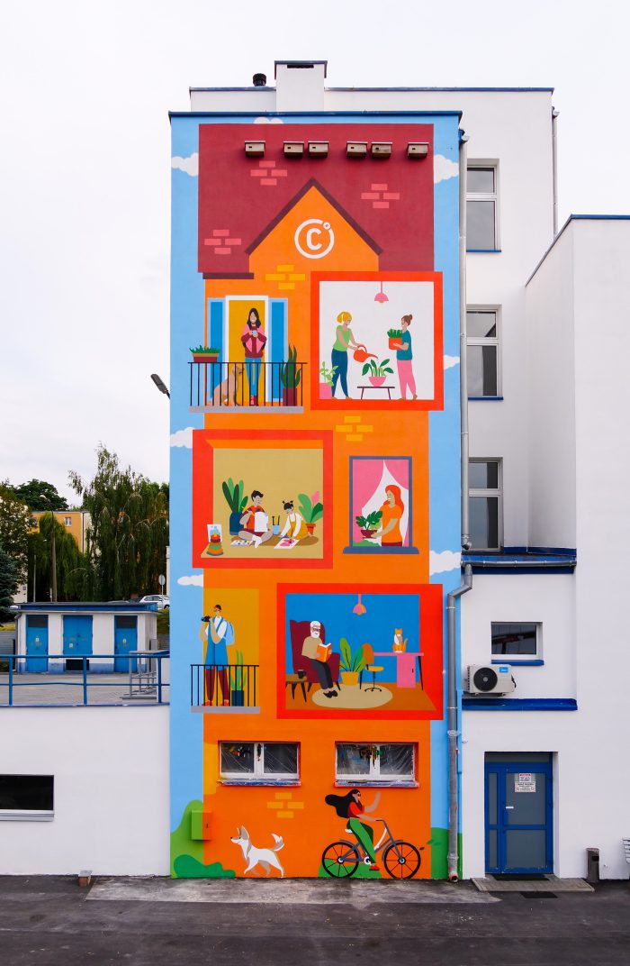 Kolejny projekt powstał w 2023 roku na ścianie biurowca LPEC przy ul. Puławskiej 28. Ten wysoki na ponad 15 metrów mural stał się symbolem myślenia o codzienności w zgodzie z naturą. Przedstawia przekrój bloku mieszkalnego i pokazuje, jak nasze codzienne decyzje – wybór środka transportu, sposób ogrzewania czy ograniczanie zużycia plastiku – wpływają na środowisko. To dzieło nie tylko edukuje, ale również realnie pomaga naturze. Jego powierzchnia została pokryta lakierem fotokatalitycznym, który oczyszcza powietrze w stopniu porównywalnym do działania kilkudziesięciu dużych drzew.